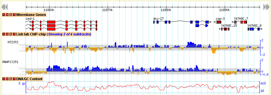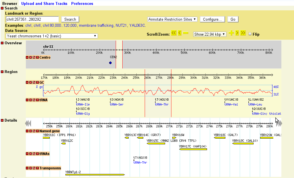 If the landmark is found in the database, the browser will display the region of the genome it occupies. The region is displayed in three graphical panels: